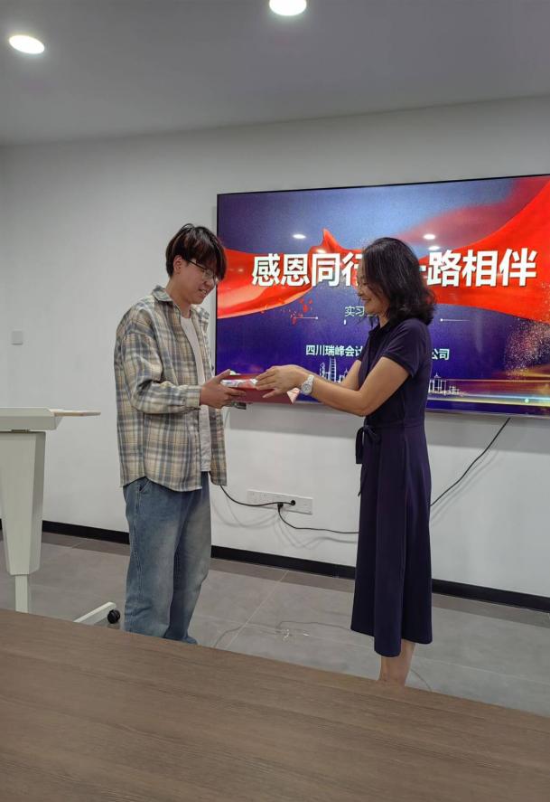 瑞峰会计师事务所总经理周晓春对我院实习生的整体素质和学习能力给予了高度评价,并向在实习中坚守审计准则,保持客观公正态度的两名实习生颁发了“廉心自守”奖状和奖金。周晓春总经理表达了未来与学院持续深化合作、共同培养更多优秀审计人才的强烈愿望。