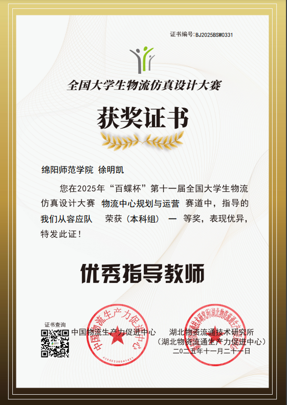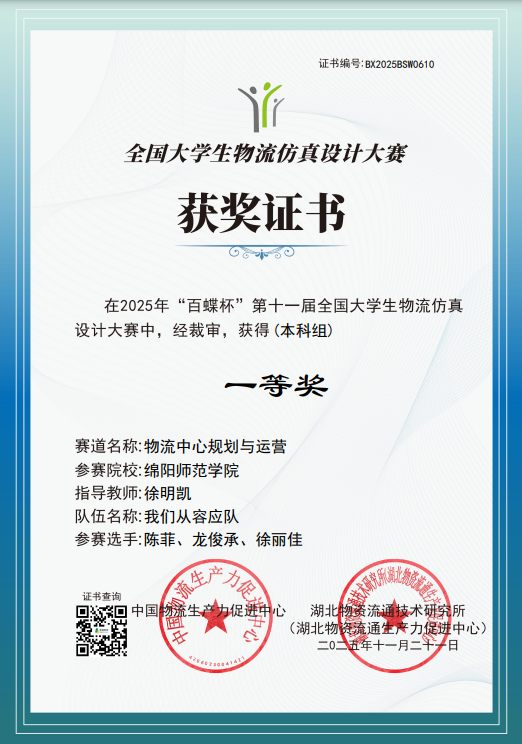 近日,由中国物流生产力促进中心主办的“第十一届全国大学生物流仿真设计大赛”公布了获奖结果。我校数字经济与管理学院学子获全国一等奖1项,三等奖1项;徐明凯获“优秀指导老师”奖。