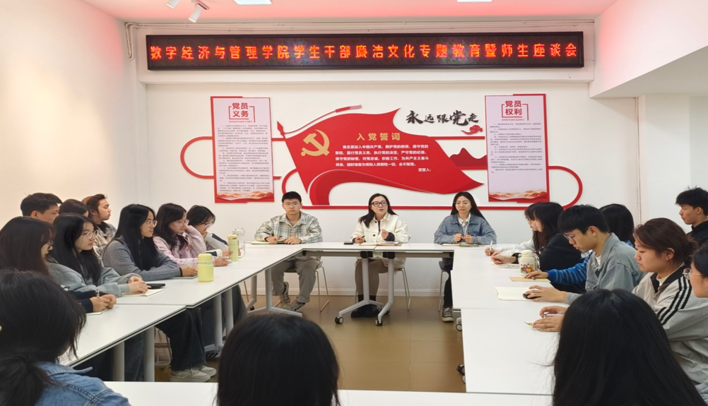 10月21日中午,数字经济与管理学院在学生宿舍三栋“一站式”学生社区召开2025年秋季学期学生干部廉洁文化专题教育暨师生座谈会。学院党委副书记、纪委书记李杨,罗小芳老师、肖俊楠老师以及全体团学干部参加会议。