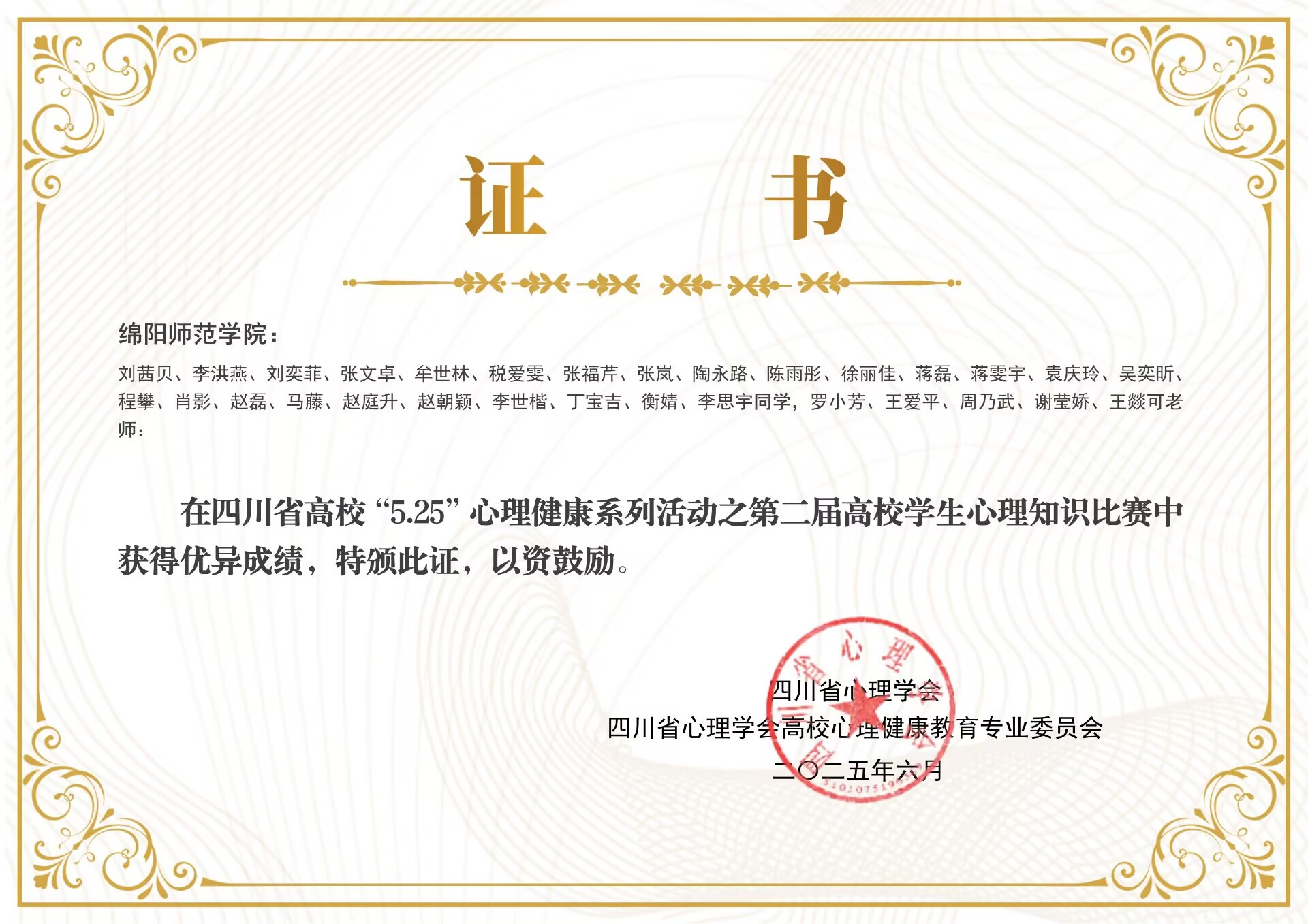6月18日,四川省心理学会高校心理健康教育专委会公布2025年四川省高校“5.25”心理健康系列活动评选结果。经过激烈的角逐,我院张福芹、税爱雯、陈雨彤、蒋磊等十五名同学荣获“四川省首届高校学生心理知识比赛-学生赛道”等级奖。