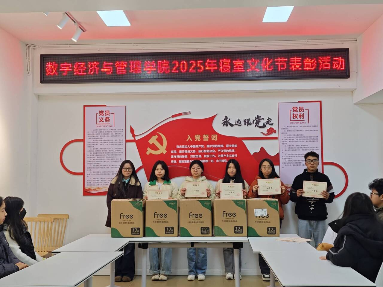 经严格评审,活动共评选出一等奖3个、二等奖5个、三等奖7个、优秀奖10个。获奖宿舍成员获得定制礼品及相应的第二课堂学分、综测加分。颁奖仪式于12月10日在三栋“一站式”学生社区举行,为活动画上圆满句号。
