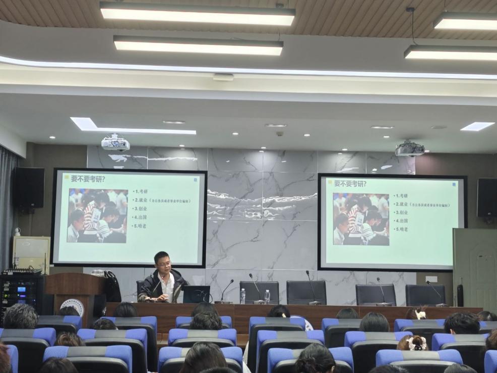 互动提问环节,学生们围绕备考规划、院校筛选、复试流程及就业趋势等问题踊跃提问。刘老师结合自身经验与行业案例,逐一给出针对性解答,现场不时响起掌声。一名参与学生表示:“不仅清楚了考研院校选择的方法,也知道了就业需要提前积累哪些能力,收获特别大。”