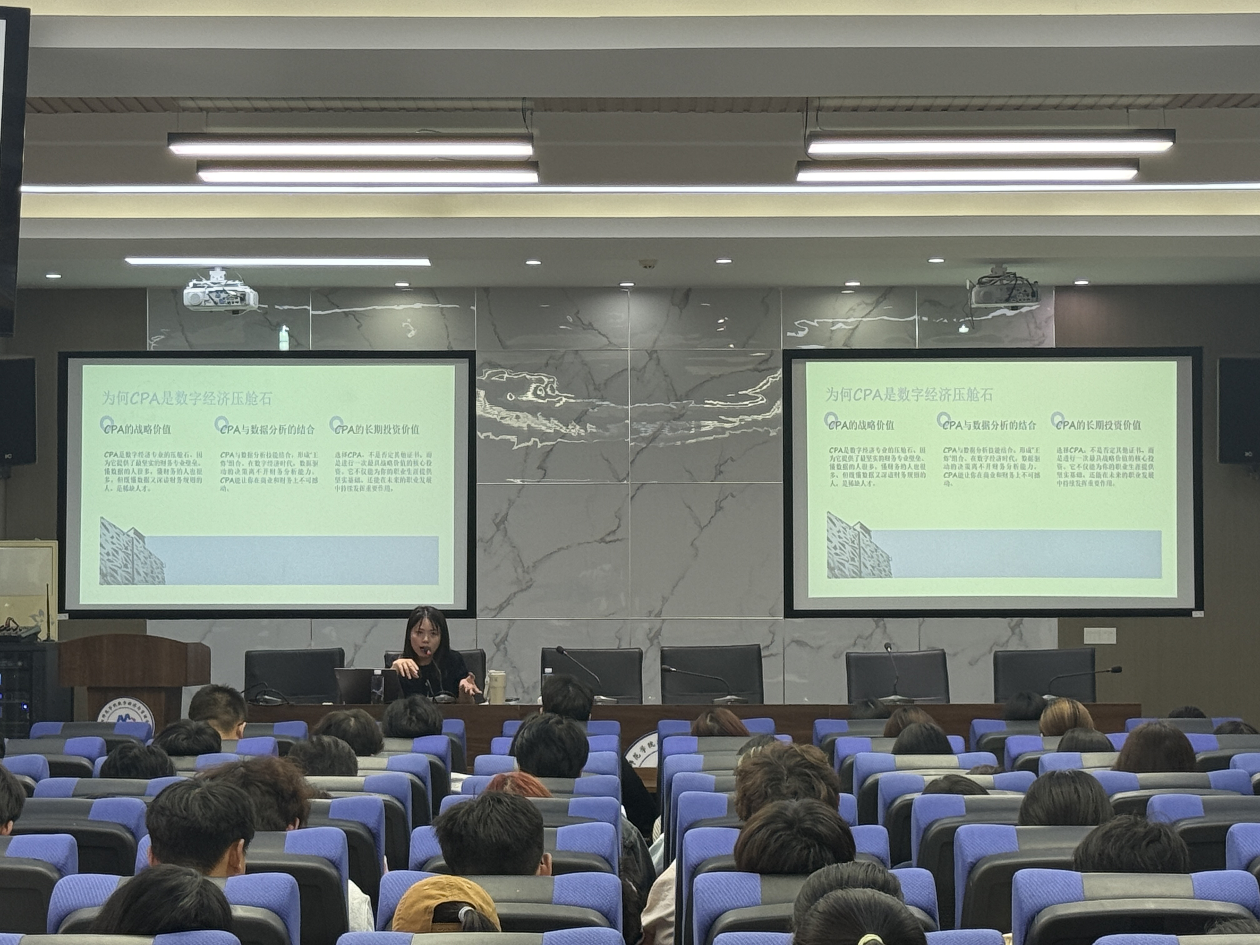 本次系列活动围绕未来职业规划展开。在审计学专场中,审计师Elve系统解析了专业核心备考路径,并介绍重要商赛信息,助力学生明确职业发展方向。数字经济专场聚焦跨界知识结构的构建,引导学生通过考取证书与参与实践提升综合素养。物流管理专场由鲍威老师主讲,从行业现状出发,强调打破信息壁垒,推动学生从“单一技能型”向“复合价值型”人才转变。